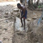 Un peu plus loin, une personne nous montre une « gaguère »[NDLR, un espace où se déroule un combat de coqs] qui se trouve à plus de 1m50 de haut du lit de la rivière. Le petit gradin et l’espace réservé pour le combat de coq sont recouverts d’une boue de couleur jaunâtre.